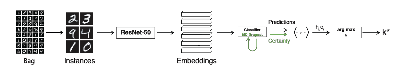 The Certainty Pooling method is based on the calculation of a certainty score that will be allocated to every instances of a bag. This certainty score is based on Monte-Carlo (MC) dropout, a method that measures certainty in Deep Learning models.