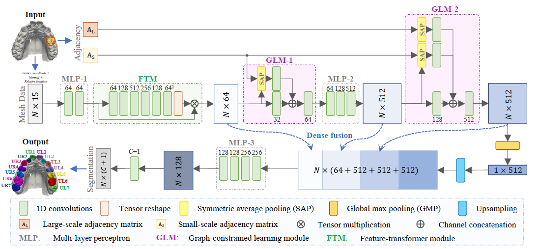 Tai-Hsien Wu, Chia-Jung Hsu, Sheng-Hong Huang, et al., “MeshSegNet: Deep Multi-Scale Mesh Feature Learning for Automated Labeling of Raw Dental Surface from 3D Intraoral Scanners,” in IEEE Transactions on Medical Imaging, vol. 39, no. 4, pp. 945-956, April 2020. Link